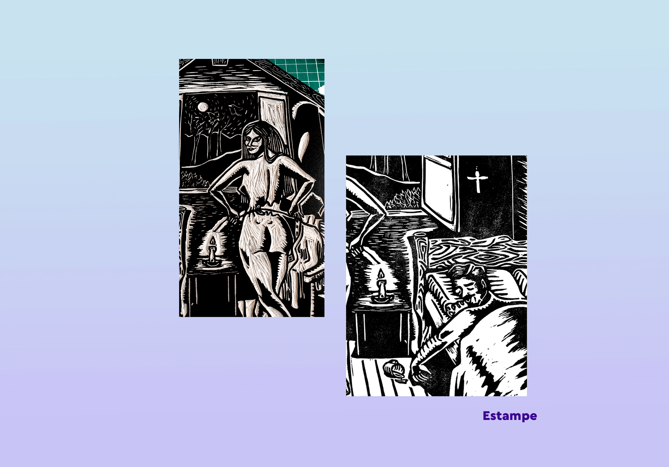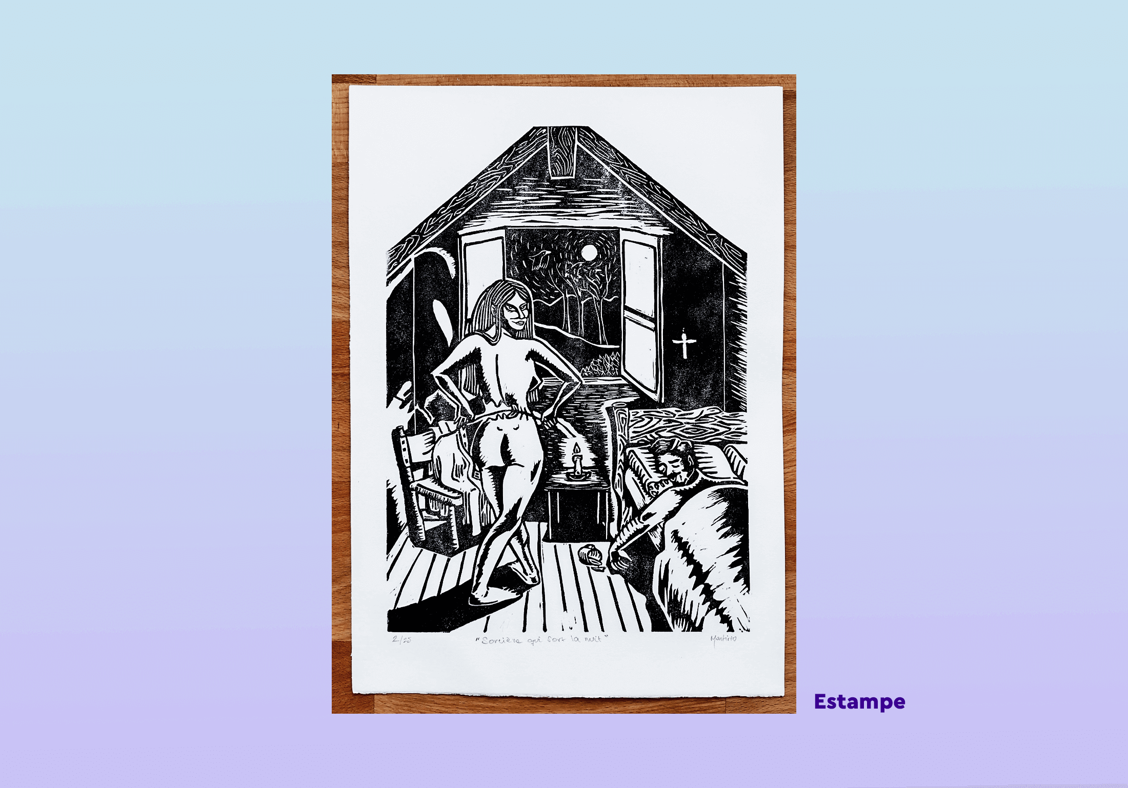 Estampe à partir d’une illutration gravée sur linoléum. "Sorcière qui sort la nuit" fait partie d'une série d'estampes sur la tradition orale de la culture de ma région d'origine, Boyacá en Colombie.