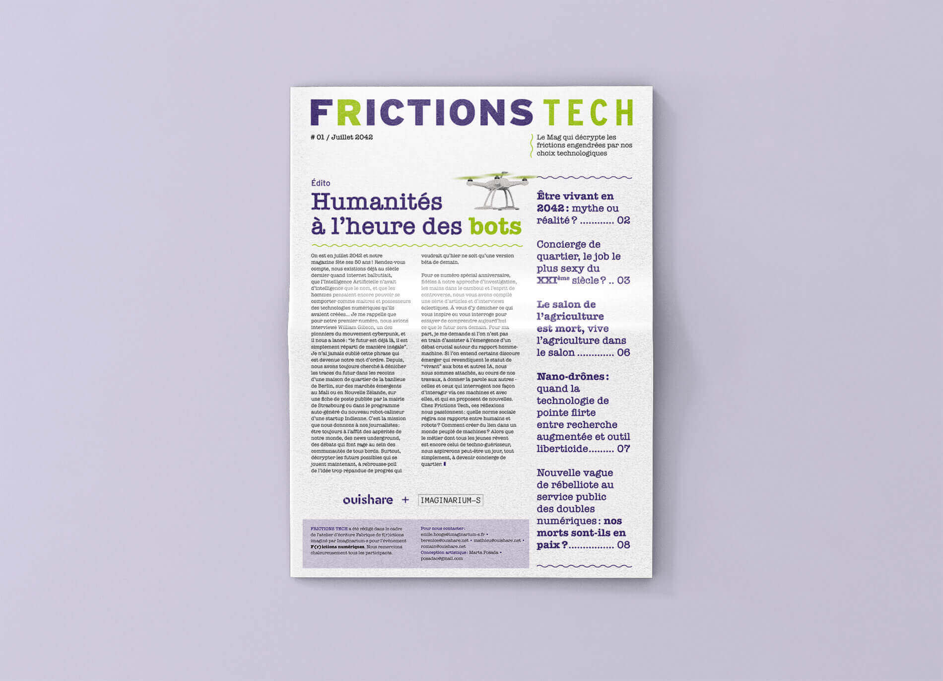 Dans le cadre de l’événement F(r)ictions numériques organisé par Ouishare, les participants ont rédigé l’édition de l’année 2042 de FrictionsTech « Le Mag qui décrypte les frictions engendrées par nos choix technologiques », dont j’ai réalisé la conception artistique et la mise en page. Cette édition inclut une affiche centrale.