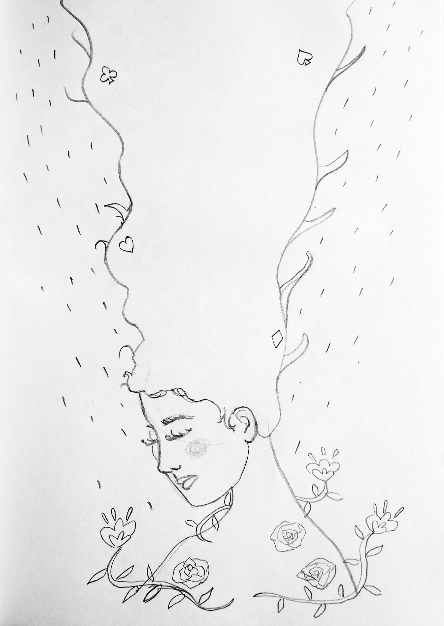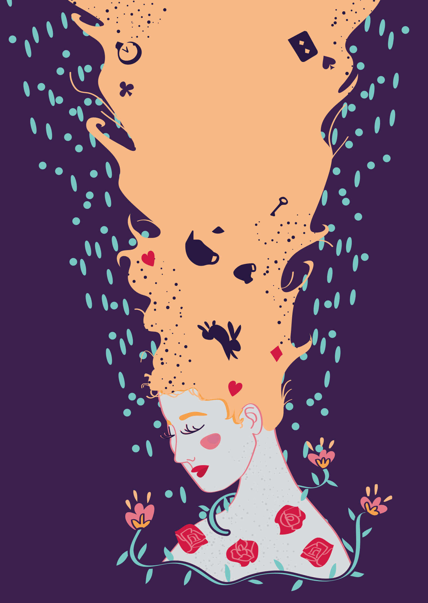 Réalisation d'une couverture illustrée pour le livre "Alice aux pays des merveilles" depuis l'esquisse jusqu'à la mise en page.