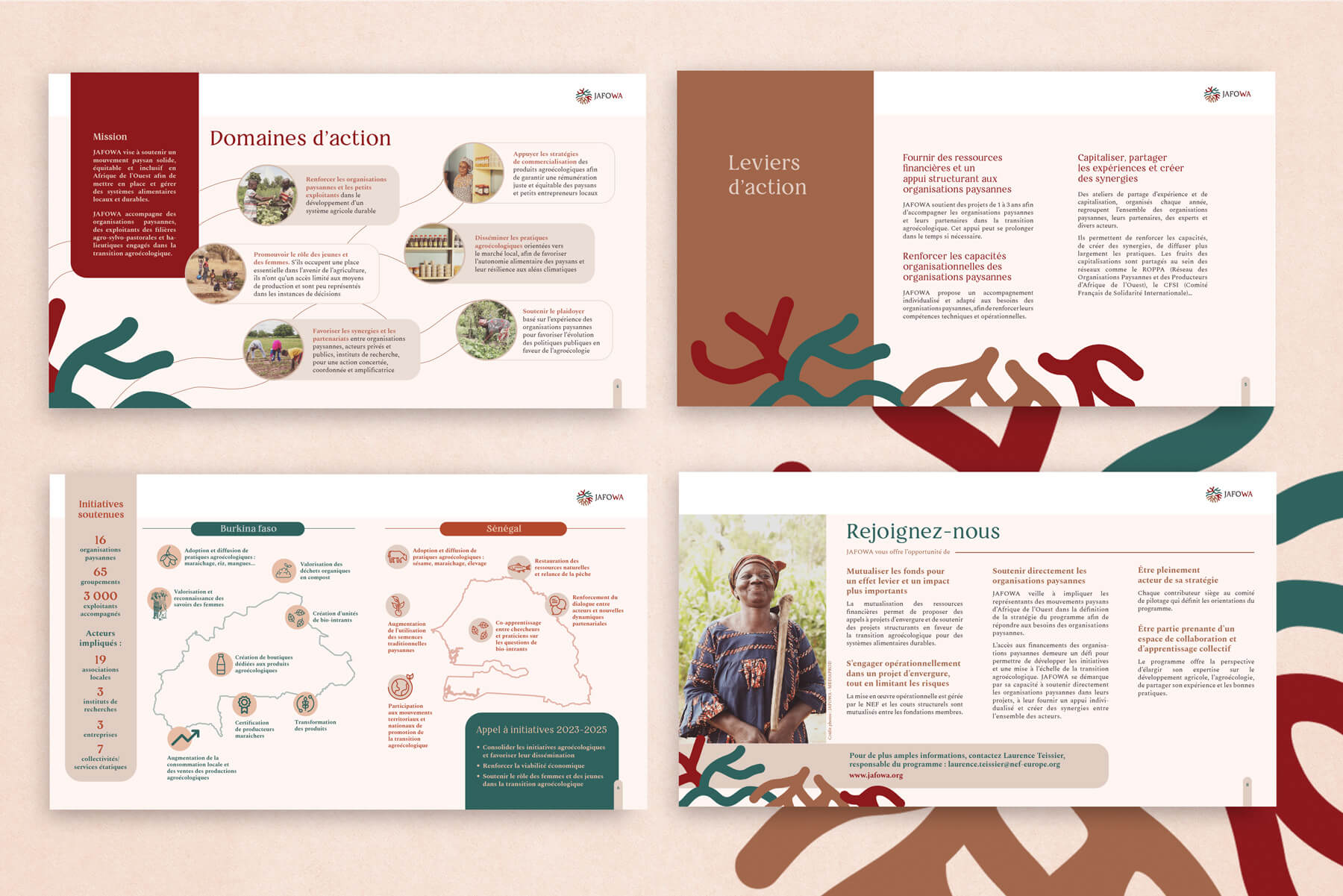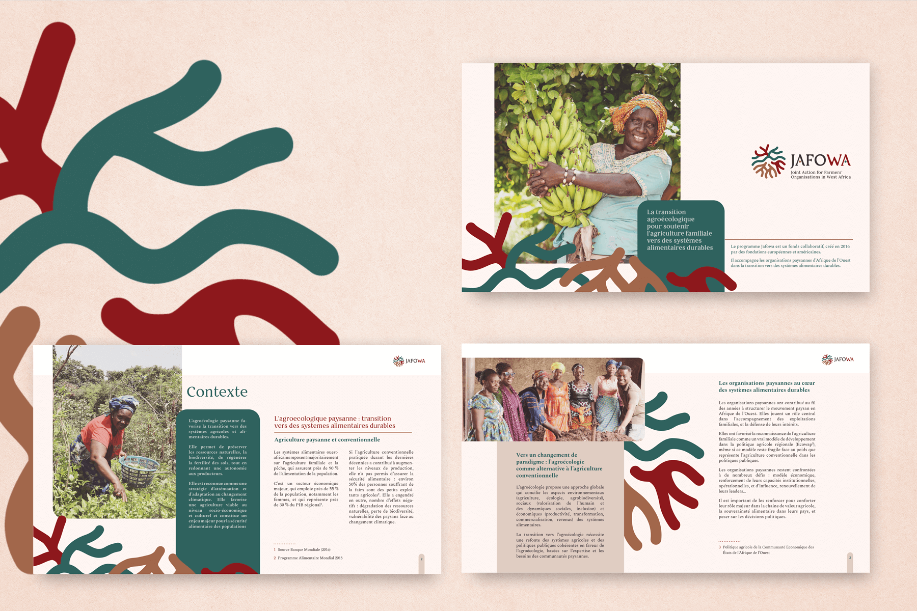 Création de l’identité visuelle et de la plaquette du programme JAFOWA (Action commune pour les organisations paysannes en Afrique de l'Ouest), dont l’objectif est de répondre aux besoins des petits exploitants agricoles en Afrique de l’ouest et de promouvoir des systèmes alimentaires locaux durables.