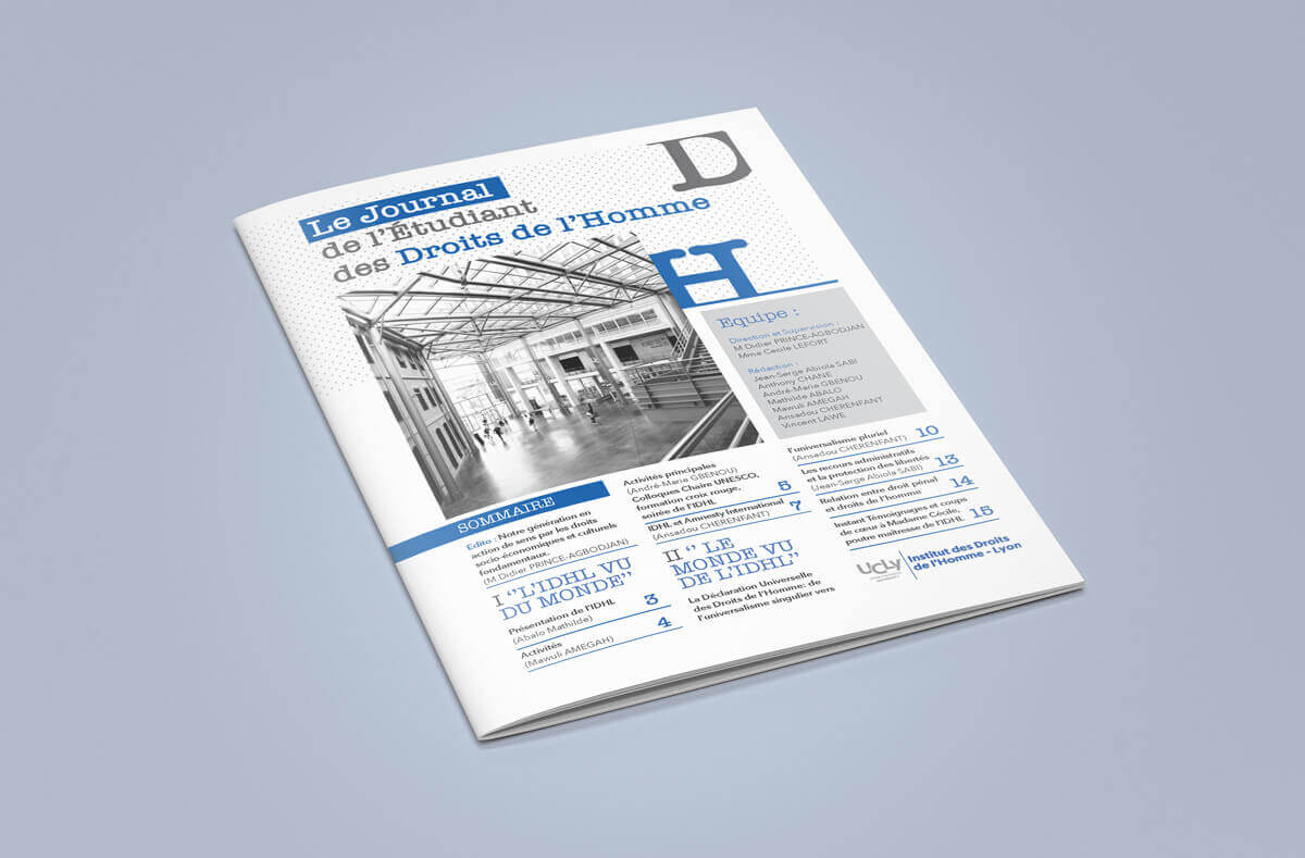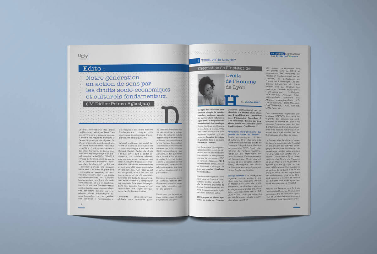 Conception et mise en page du journal de l'etudiant des droits de l’homme de l'IDHL à l’Université Catholique de Lyon en 2017.